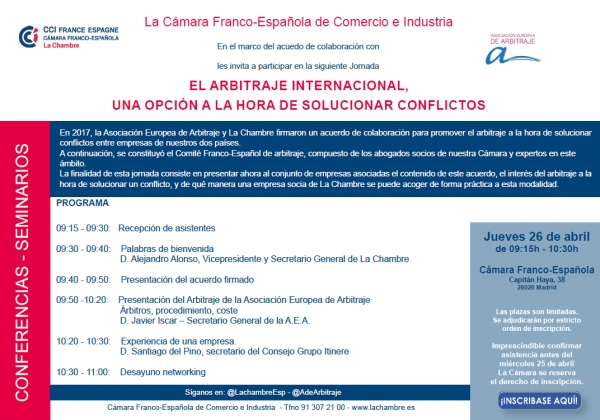 En 2017, la Asociación Europea de Arbitraje y La Chambre firmaron un acuerdo de colaboración para promover el arbitraje a la hora de solucionar conflictos entre empresas de nuestros dos países. A continuación, se constituyó el Comité Franco-Español de arbitraje, compuesto por los abogados socios de nuestra Cámara y expertos en este ámbito. La finalidad de esta jornada consiste en presentar ahora al conjunto de empresas asociadas el contenido de este acuerdo, el interés del arbitraje a la hora de solucionar un conflicto, y de qué manera una empresa socia de La Chambre se puede acoger de forma práctica a esta modalidad.