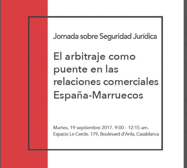 El próximo martes 19 de septiembre tendrá lugar la Conferencia sobre “Seguridad jurídica: el arbitraje como puente en las relaciones comerciales España-Marruecos” que organizan la Corte Hispano-Marroquí de Arbitraje y la Oficina Económica y Comercial de la Embajada de España en Casablanca, en colaboración con CaixaBank. El objetivo será debatir y poner en valor el recurso al arbitraje en las relaciones económicas y comerciales entre España y Marruecos y comentar experiencias de empresas y abogados españoles y marroquíes en dicho ámbito. Se desarrollará el 19 de septiembre entre 9:00 y 12:15 am en el Espacio Le Cercle de CaixaBank en Casablanca (179, Boulevard d’Anfa) Para ello, cuentan con la presencia del Embajador de España en Marruecos, Excmo. Sr. D. Ricardo Díez-Hochleitner, quién clausurará el acto, y varios actores con larga experiencia en las relaciones empresariales entre España y Marruecos, el ejercicio de la abogacía y el arbitraje, entre ellos Ali Kadiri, Consejero de Caixabank Marruecos; Abdelmalek Ouardighi, Secretario General de la Corte Hispano-Marroquí de Arbitraje; Jose Ignacio García Muniozguren, Socio Director Garrigues Marruecos; Rafael Gómez de la Serna, Socio De Pasqual & Marzo Abogados; Miguel Guerrero Acosta, Socio Director Guerrero Acosta Abogados; y Tarik Mossadek, Socio Director Mossadek & Partners.  La asistencia a la conferencia será gratuita y contará con servicio de traducción simultánea. Las entidades organizadoras animan a todos los interesados a participar en este evento de importancia para las empresas españolas y marroquíes. Para ello, pueden contactar con la Oficina Económica y Comercial de la Embajada de España en Casablanca antes del próximo 8 de septiembre. En caso de estar interesado en asistir a la conferencia, se ruega envíe un correo a la siguiente dirección: Esta dirección de correo electrónico está siendo protegida contra los robots de spam. Necesita tener JavaScript habilitado para poder verlo..»>casablanca@comercio.mineco.es. El aforo es limitado y se atenderá el orden de llegada de las peticiones de asistencia. Para más información consulte: http://www.icex.es/icex/es/navegacion-principal/todos-nuestros-servicios/informacion-de-mercados/paises/navegacion-principal/noticias/NEW2017732162.html?idPais=MA